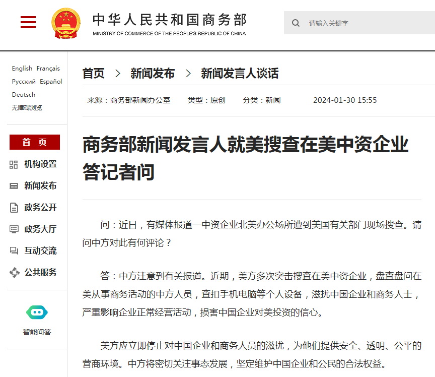 答:中方注意到有关报道。近期,美方多次突击搜查在美中资企业,盘查盘问在美从事商务活动的中方人员,查扣手机电脑等个人设备,滋扰中国企业和商务人士,严重影响企业正常经营活动,损害中国企业对美投资的信心。