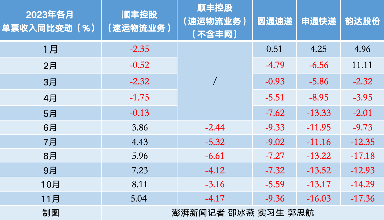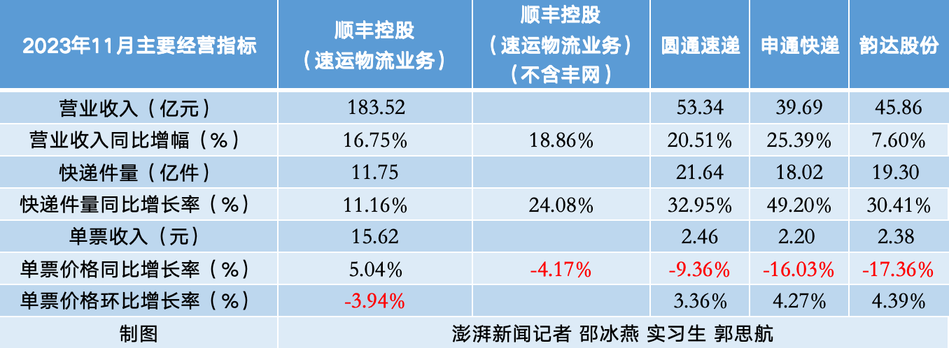 截至12月19日晚间,顺丰控股(002352)、圆通速递(600233)、申通快递(002468)、韵达股份(002120)四家A股快递公司陆续披露完11月快递业务经营简报。其中,不含丰网业务的顺丰控股速运物流业务单票收入同比下降4.17%(其中经济快递板块中的丰网业务已于2023年6月完成转让交割)。圆通、申通和韵达三家单票收入同比降幅再次扩大,其中申通和韵达降幅创年内新高,达16.03%和17.36%。