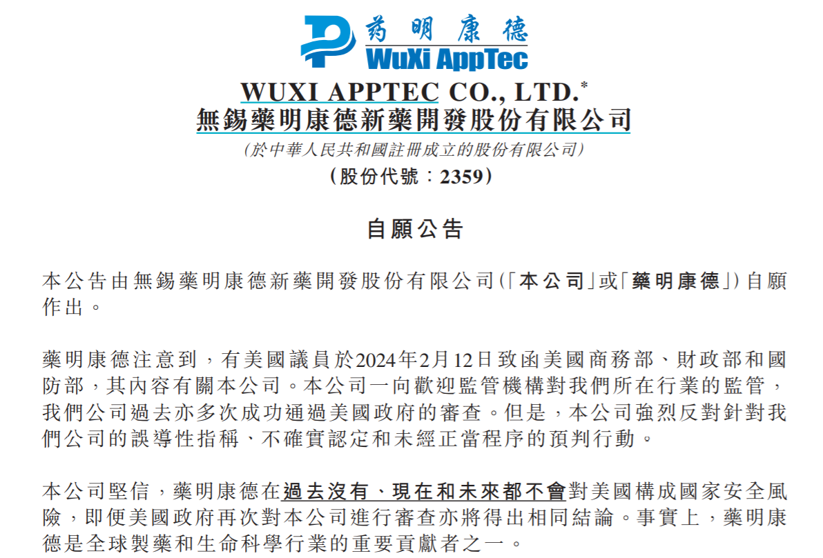 2月13日晚间,药明康德在港交所公告称,有美国议员于2024年2月12日致函美国商务部、财政部和国防部,其内容有关药明康德。